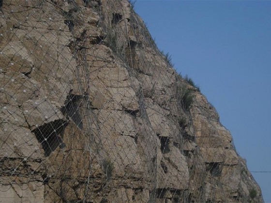鋼絲繩網(wǎng)又名邊坡防護(hù)網(wǎng),主要分為主動防護(hù)網(wǎng)系統(tǒng)和被動防護(hù)網(wǎng)系統(tǒng)。鋼絲繩網(wǎng)是以高強度鋼絲繩柔性網(wǎng)(菱形鋼絲繩網(wǎng)、環(huán)形網(wǎng)、高強度鋼絲格 柵)作為主要構(gòu)成部分.并輔以錨桿、支撐繩等配件構(gòu)成整個系統(tǒng)。以覆蓋、緊固坡面的方式來防治坡面巖石崩塌、滾落、爆破飛石等危害