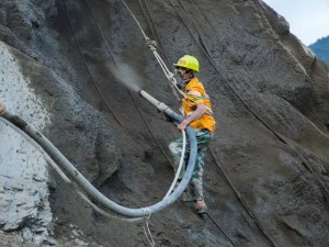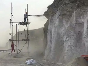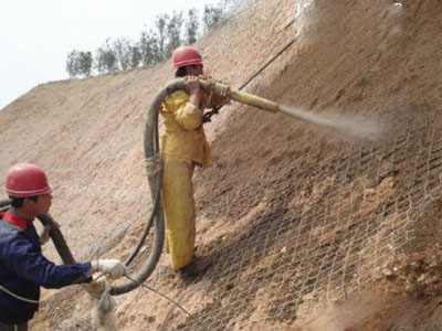 噴射護坡砼強度等級C10- C50。本工程采用干式噴射技術,噴射機型號為PZ-5B型噴射機。該機干噴能力為5~5.5M3/h,輸送距離水平可達200m,垂直為40M,電機功 率為7.5KW,空壓機工作電源為380V/75KW。砼噴射回彈率25~35%。