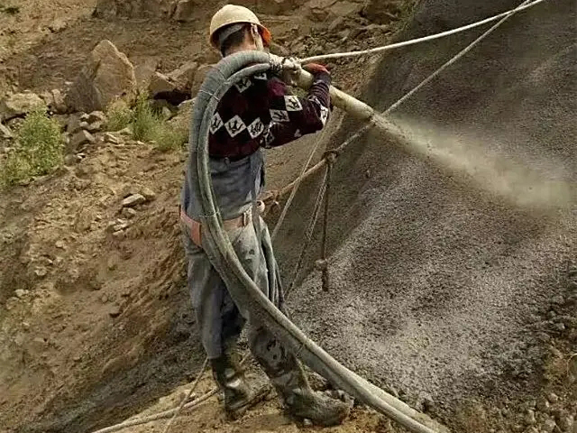 噴射護坡砼強度等級C10- C50。本工程采用干式噴射技術,噴射機型號為PZ-5B型噴射機。該機干噴能力為5~5.5M3/h,輸送距離水平可達200m,垂直為40M,電機功 率為7.5KW,空壓機工作電源為380V/75KW。砼噴射回彈率25~35%。